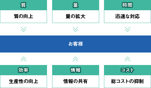 お客様の求める付加価値の要素を「質・量・時間・効率・情報・コスト」と捉え、お客様の実態およびニーズを的確に把握した うえで、お客様にとっての価値を発見・創造し、本質的な価値を提案・提供します。